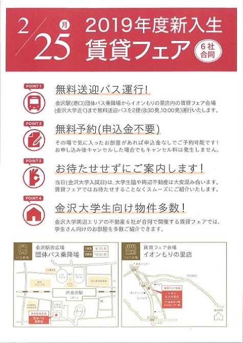 金沢大学前期日程試験日 2月25日(月)に、イオンもりの里ショッピングセンターにおいて、受験生の親御様向け【賃貸フェア】を開催いたします。